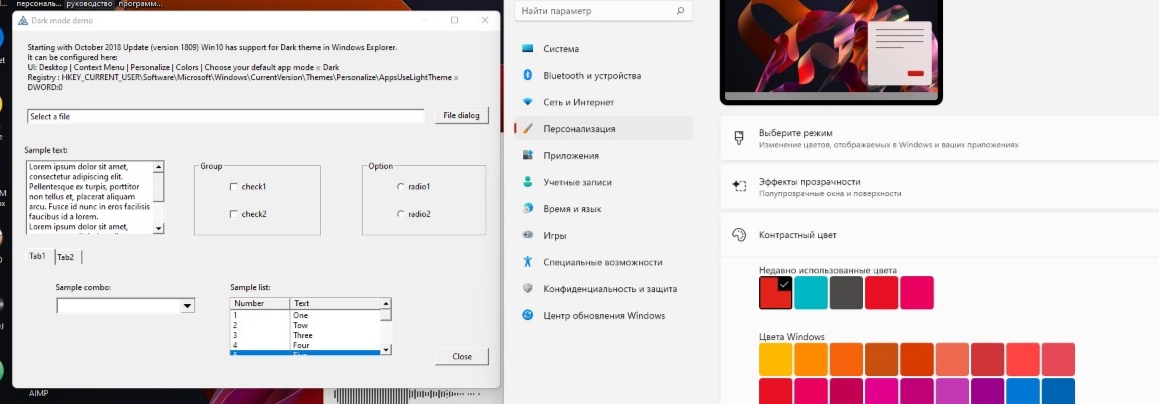 Никто не продвинулся в этом вопросе? Я посмотрел, как в notepad++ сделано, там можно просто выбрать dark Mode, можно цвета для элементов понастраивать. Поигрался у себя в приложении, списки, поля ввода и т.п. настраиваются с приемлемым результатом (не чёрным, а оттенками серого, вполне так нормально получается) , а, например, к ползунку в списках вроде как штатно не добраться. Через win api что-ли только?