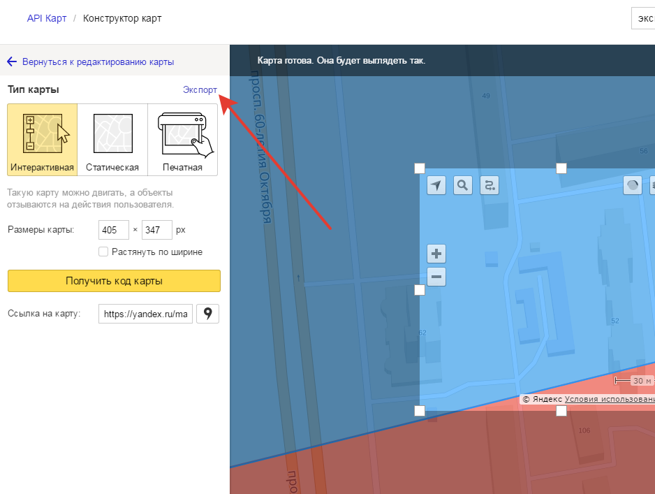 Вопрос пока отпал. Нашел где экспорт в конструкторе Yandex карт