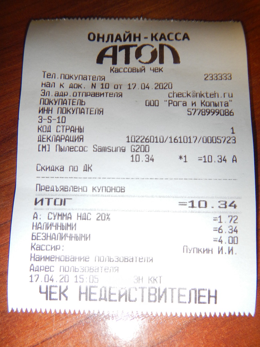 2. Печатаем на ФР. Результат (как Вы помните, я ничего ручками в чеке не дорисовываю):