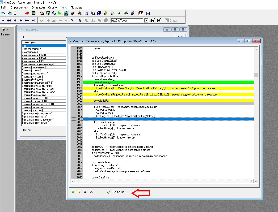По названию процедуры определяется ее clw модуль. Этот clw копируется в clws, содержимое которого выводится для просмотра на экран. Поиском (или пролистыванием) находим место, где хотим сделать замеры. Ставим маркеры начать замеры, фиксировать замеры, завершить замеры. В тексте эти строки выделяются, соответственно, зеленым, желтым и серым. Нажимаем Сохранить, после чего в исходный clw вставляется дополнительный код.