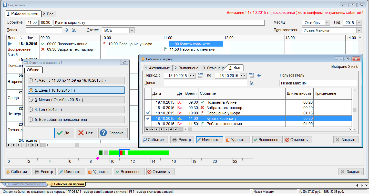 цветами полоски показаны выполненные, отмененные, актуальные события, а также конфликт (наложение) актуальных событий;