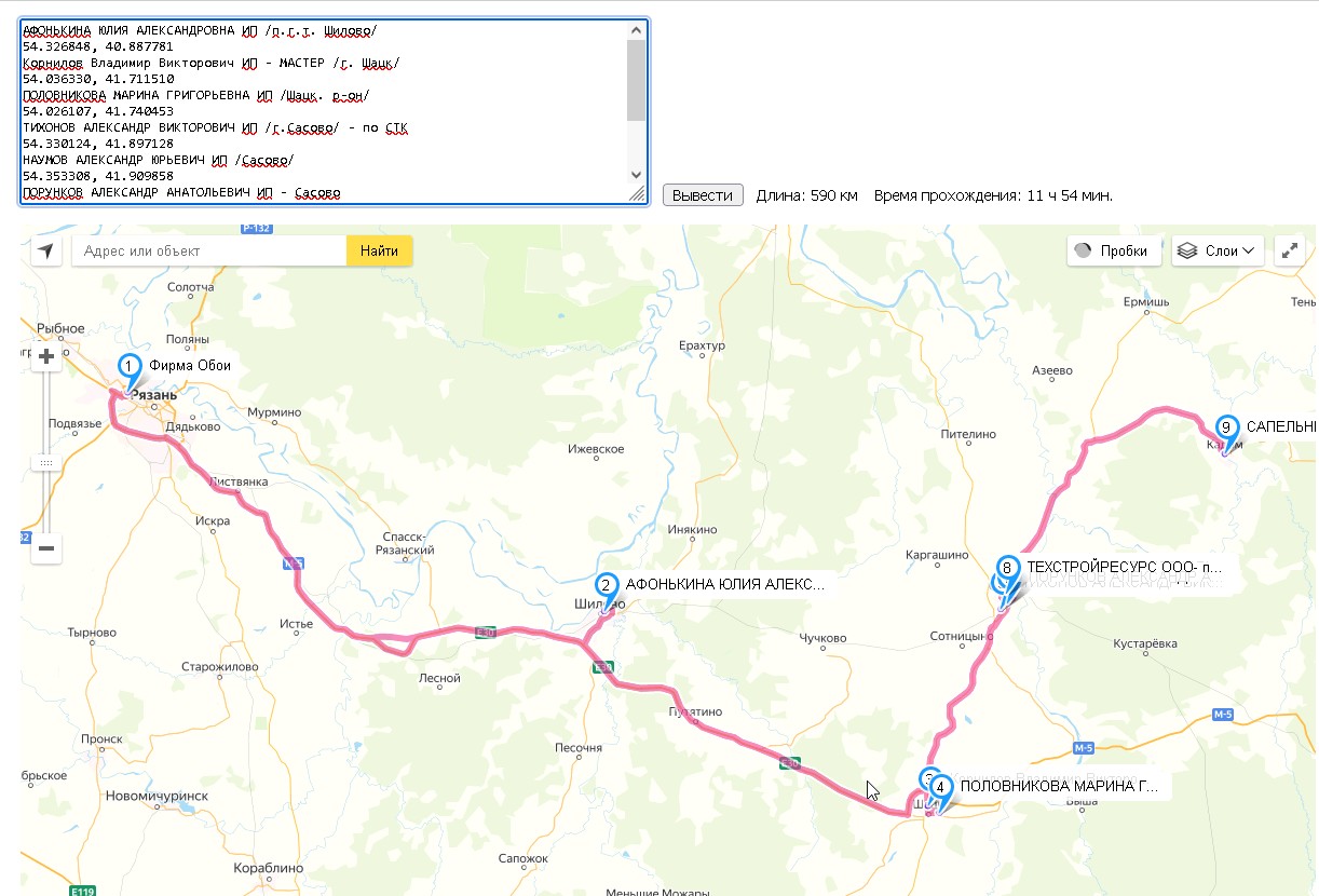 Далее с помощью кнопок вверх/вниз упорядочиваем получателей в маршруте. Попытка автоматического определения следования получателей привела к большому количеству обращений к геокодеру и выходу за рамки бесплатного тарифа. Порядок следования сохраняется в документе "Доставка" при нанесении маршрута на карту, поэтому расстановка делается один раз. Вопрос с дефолтной расстановкой получателей в новой доставке пока обсуждается, есть варианты. Когда список упорядочен, жмем кнопку "На карту". Маршрут копируется в буфер обмена. Переключаемся на страничку логиста в вебе, в текстовом поле ввода жмем вставить, затем кнопку "Вывести". Маршрут выводится на карту, включая наименования получателей. Рассчитывается длина маршрута (без учета пробок) и время следования на автомобиле. Маршрут, разумеется, закольцован на начальную точку отгрузки. Страничка не интегрирована в приложение, так как учетная система работает на сервере, не имеющем доступа в интернет. Для построения маршрута используется javascript.