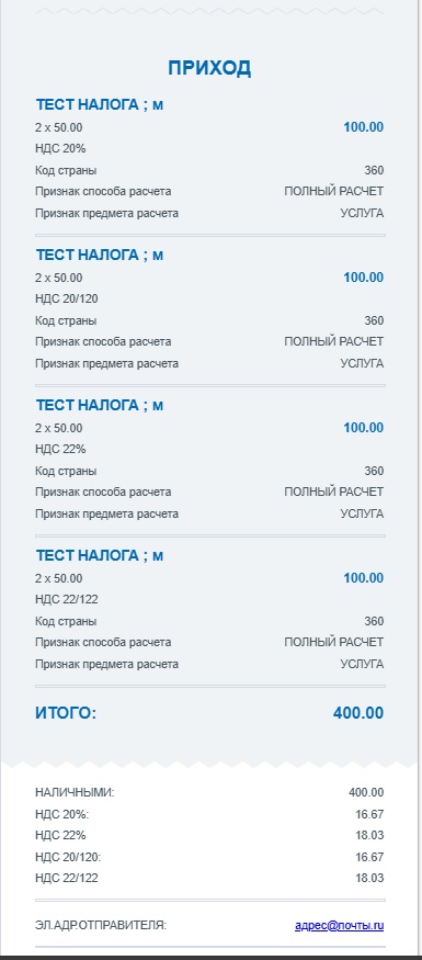 Это чек на тестовом стенде, как я понимаю. Вы можете сейчас пробить чек с 22% на работающей кассе?