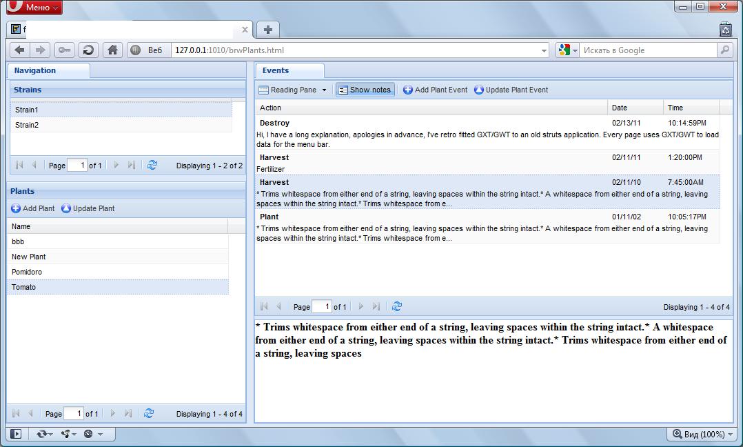 Картинку прицепил - вот такой вид у страницы, над которой сейчас работаю (сделана на основе примера Feed Viewer http://dev.sencha.com/deploy/dev/exampl ... /view.html). Кстати, разные браузеры ведут себя по разному иногда, например Опера не меняет мышиный курсор при наведении на сплиттер между панелями, IE более строго относится к грид-колонкам типа date (не укажешь явно dateFormat - получишь пустую колонку).