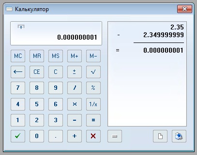 Встроенный калькулятор Windows 7 2.35 - 2.349999999 = 0.000000001