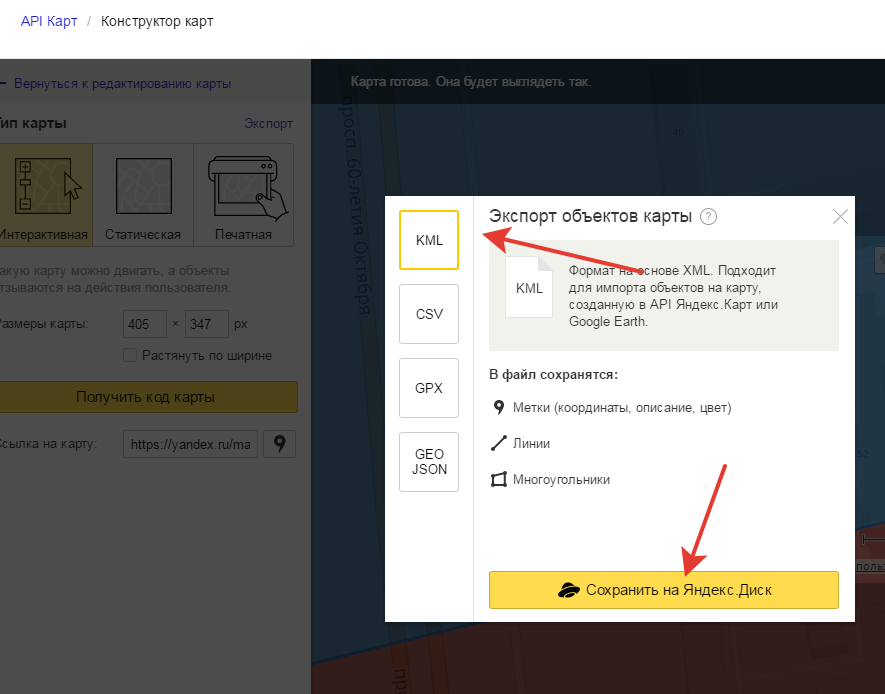 Вопрос пока отпал. Нашел где экспорт в конструкторе Yandex карт
