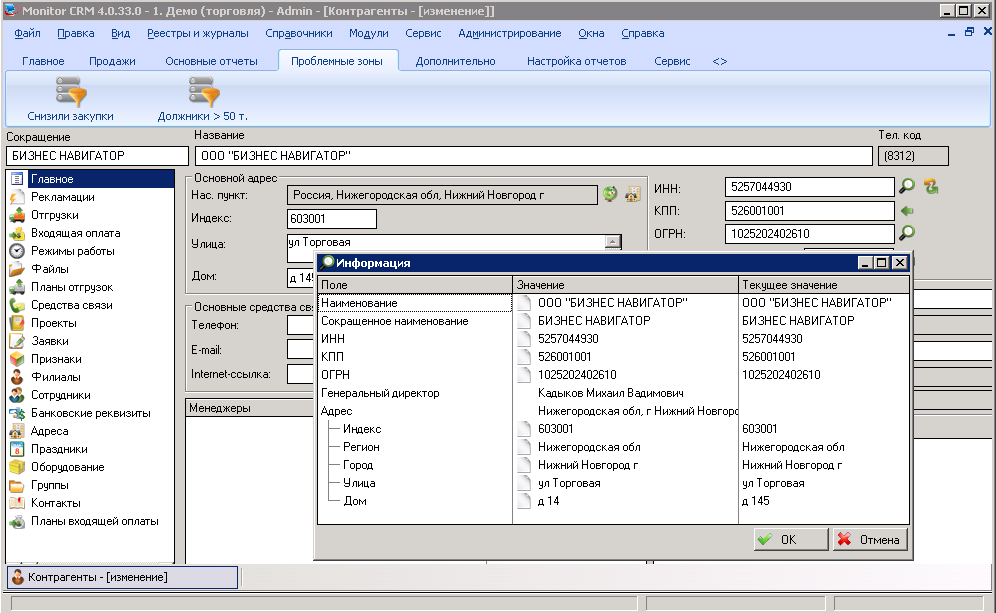 рядом с полями ИНН и ОГРН кнопка поиска, выдает такое окошко, ставим галки и обновляем информацию в базе. Весьма симпатично и полезно получилось, спасибо за наводку