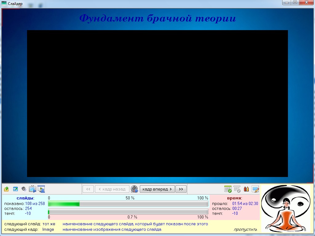 3. Отображение окна презентации на весь экран. Нужен для проведения off-line, живых презентаций. Но в этом случае панель управления нужно будет вынести или на расширенный рабочий стол или создать модуль сетевого взаимодействия между другим компьютером, на котором будет запущена программа панели управления и окном презентации.
