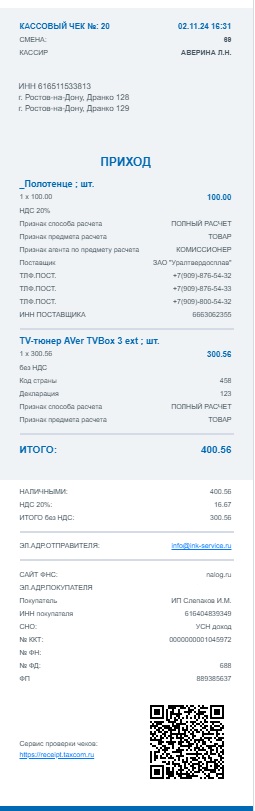 Спасибо, я таким не занимаюсь, есть специально обученные люди. По скриншоту чека резануло глаз, что для части товаров, проданных с НДС, в итогах указана сумма НДС, а для товаров, проданных без НДС, указана полная сумма без НДС. Это все равно, что смешать мягкое и теплое.Игорь Столяров писал(а): 02 Ноябрь 2024, 17:43 Поставьте современную версию драйвера АТОЛ и прошивку 5.12 и выше.