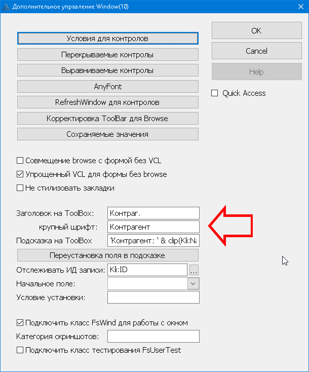 Краткое назначение можно задать в настройке шаблона. Иногда оно получается сокращенным, тогда для крупного шрифта можно задать альтернативное название (панель при крупном шрифте шире). Здесь же задается формула для всплывающей подсказки и набор контролов, при акцептовании которых надо синхронизировать всплывающую подсказку с информацией в окне.