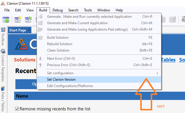 Эксперементирую в среде C11.1 c приложениями на С6, для этого переключил среду в Сlarion 6.0 Все было нормально, потом увидел и ради любопытства получил "головняк" - выполнил сброс IDE (перед этим, правда, создал резервную копию папки C11.1) А вот после этого запускаю С11.1 и вижу, что меню переключения в Сlarion 6.0 больше нет: Зашел \AppData\Roaming и удалил там папку SoftVelocity - тоже не помогло. Восстановил резервную папку C11.1 - опять безрезультатно