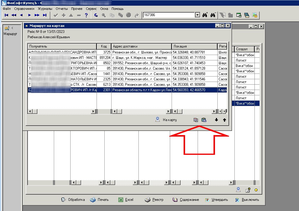 Далее с помощью кнопок вверх/вниз упорядочиваем получателей в маршруте. Попытка автоматического определения следования получателей привела к большому количеству обращений к геокодеру и выходу за рамки бесплатного тарифа. Порядок следования сохраняется в документе "Доставка" при нанесении маршрута на карту, поэтому расстановка делается один раз. Вопрос с дефолтной расстановкой получателей в новой доставке пока обсуждается, есть варианты. Когда список упорядочен, жмем кнопку "На карту". Маршрут копируется в буфер обмена. Переключаемся на страничку логиста в вебе, в текстовом поле ввода жмем вставить, затем кнопку "Вывести". Маршрут выводится на карту, включая наименования получателей. Рассчитывается длина маршрута (без учета пробок) и время следования на автомобиле. Маршрут, разумеется, закольцован на начальную точку отгрузки. Страничка не интегрирована в приложение, так как учетная система работает на сервере, не имеющем доступа в интернет. Для построения маршрута используется javascript.