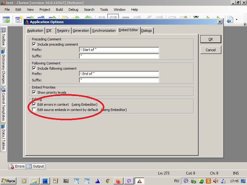 В clarion6, когда при компиляции обнаруживаются ошибки в эмбедах, то среда позиционируется на них в "полосатом редакторе" и тут же дает их исправлять. А в clarion10 она открывает сгенеренные сырцы (clw), все правки в которых будут потеряны после очередной кодогенерации. Есть ли какая возможность редактирования ошибок в эмбедах как раньше в clarion6?