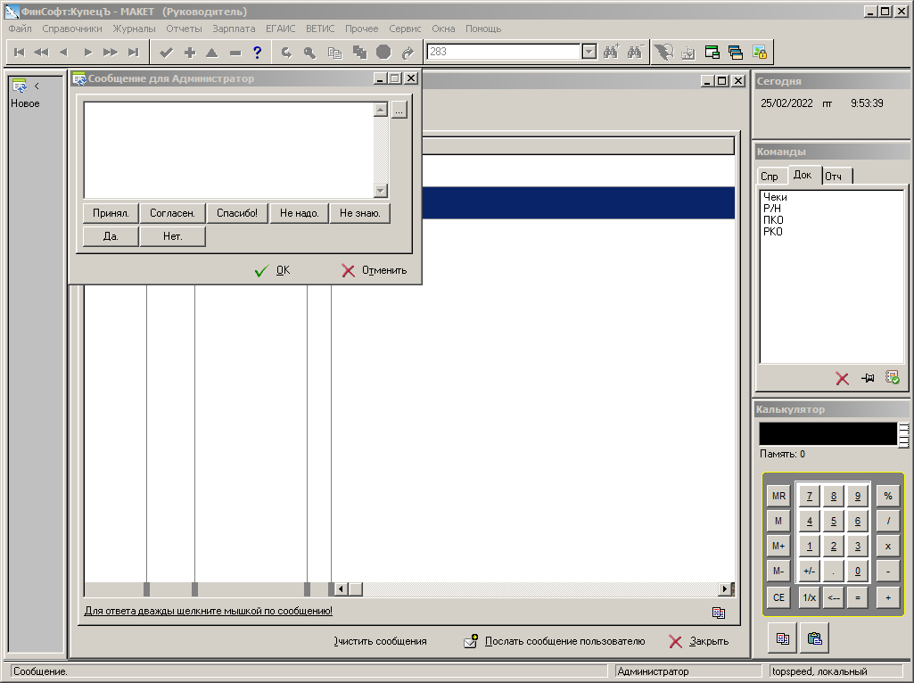 По ходу обсуждения пришла мысль сделать кнопки со стандартными ответами, типа принято, согласен, спасибо, не надо и т.п. Наподобии телеграмм. Для сервиса быстрых сообщений очень удобно.