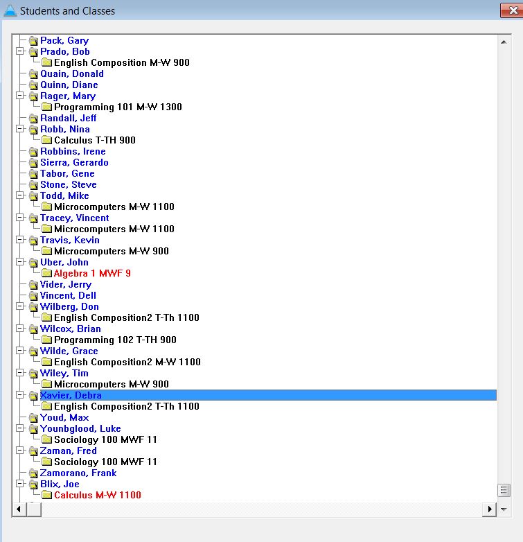 Беру приложение из Examples School. Иду в Students and Classes. Раскрываю весь список. Выбираю запись Xavier Debra. И начинаю развёртывать свёртывать ветку Yangblood Luke.