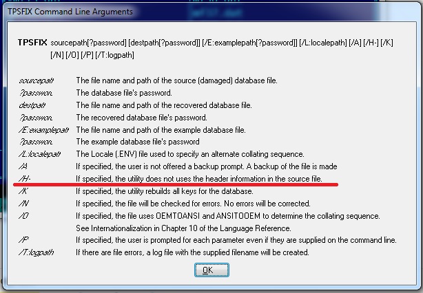 Кстати, ниже в той же справке приводится пример с запуском "TPSFIX.EXE ... /H", который вообще воспринимается как ошибка.