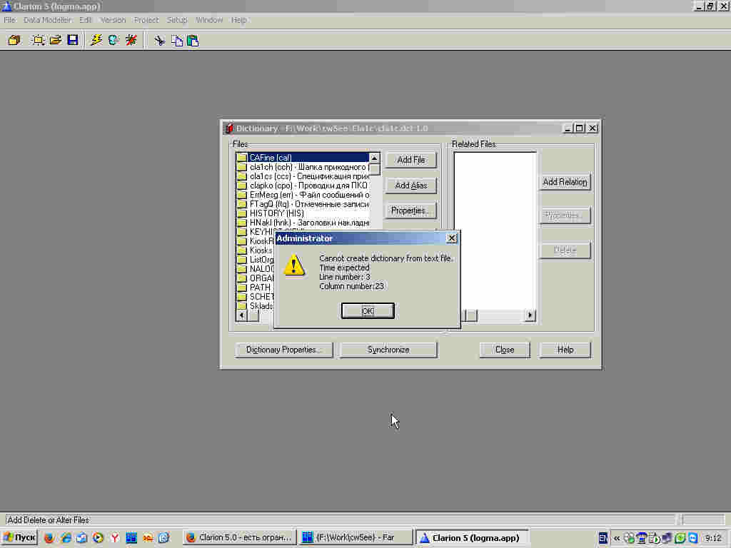 Забыл ещё один вариант (я бы его поставил перед пунктом "валить", впрочем возможен вариант и после): переделать app на multi dll.kreator писал(а): У меня на C5.5 регулярно такое было. Есть подозрение, что очень большая App. При открытии App с изменённым словарём Кларион пытается что-то в App переделать. И в общем вылетает по тайм-ауту (по-моему ошибка 755, точно не помню). Помогает: 1. повторная загрузка App (только нужно убить процессы, типа wowexec), 2. На вопрос восстановить или запустить сохранённые Апп/словарь отвечать "запустить сохранённые", 3. Перезагрузка Винды, 3. Запуск на Win7-32, Win7 грузит Апп на порядок быстрее. Ну и стандартный совет (не могу без этого) - валить с C5.0.