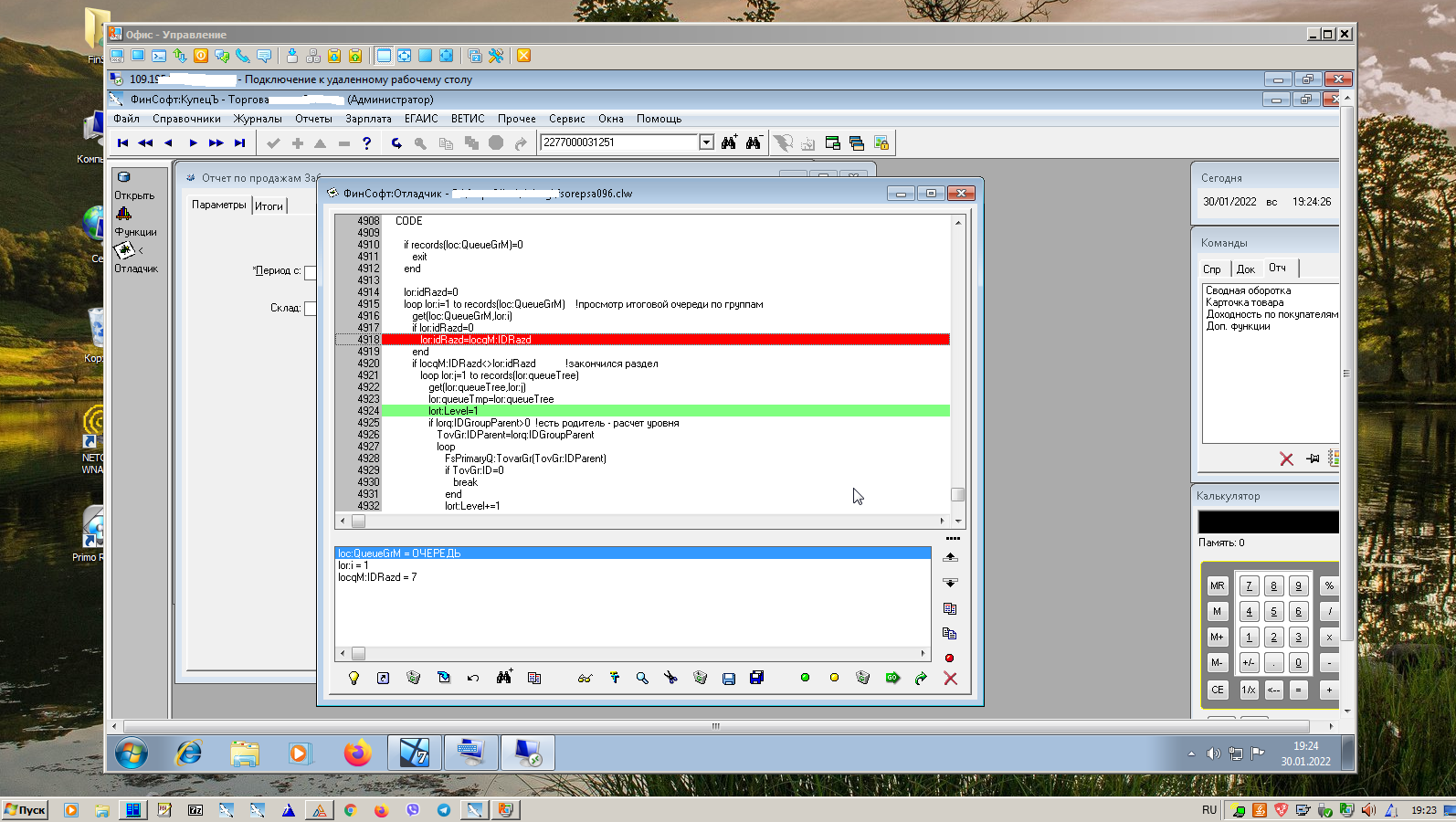 Понадобилась пошаговая отладка на удаленном компьютере. Иногда удобно пошагово прогнать работу какого-то алгоритма на реальной базе данных у клиента. База может быть большой, чтобы тянуть ее к себе, а на тестовой создать ситуацию сложно. Решение достаточно простое. Для отладки, кроме dll с включенными вызовами отладчика, нужны еще 2 clw файла, исходный и модифицированный. Делаем в каталоге программы специальный подкаталог debug и копируем туда clw файлы. Класс отладчика при инициализации проверяет их наличие и использует автоматически. Затем замещаем dll. В определенных ситуациях достаточно переименовать старую, чтобы не прерывать работу пользователей. На скриншоте работа отладчика на удаленном компьютере.