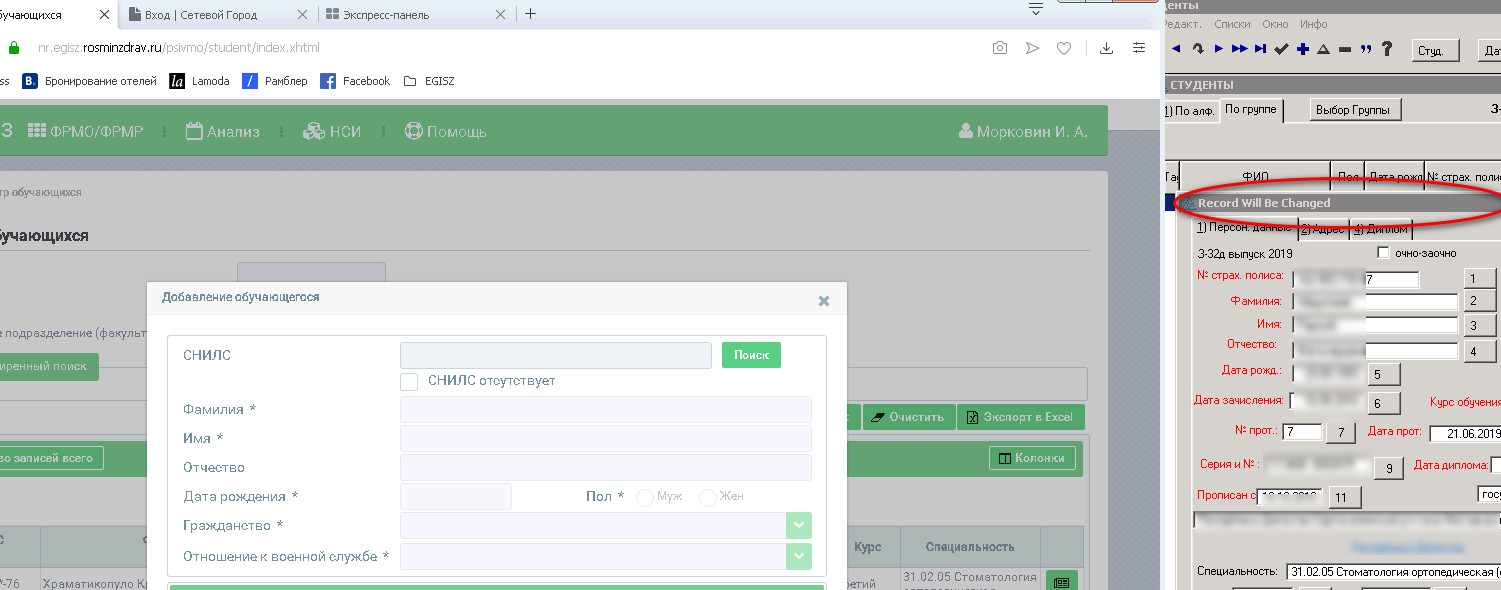 См. скриншот. Слева - окно ЕГИСЗ(ФРМР), куда надо вбивать сведения из БД колледжа
