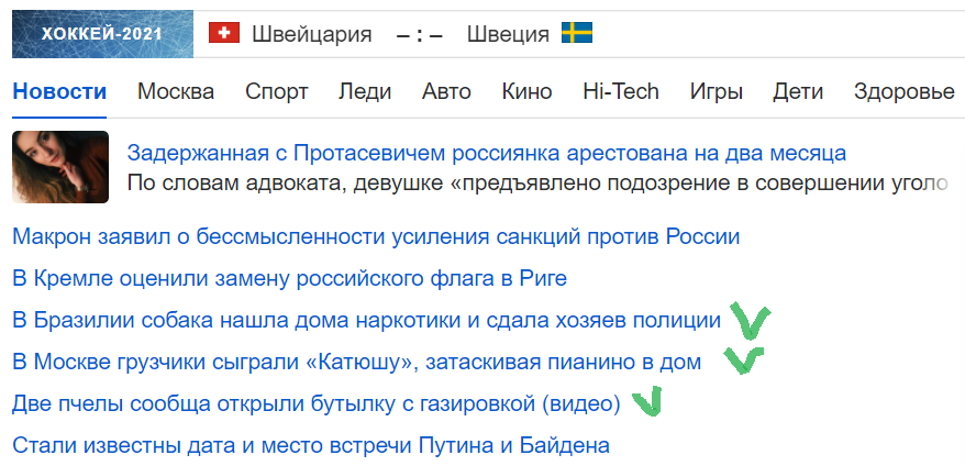Можно подумать, просто Яндекс новости не помоище. Особенно московские - то у них в горячем счёт первого периода вчерашнего матча, то монтаж плафонов на станции Мамыри закончен на 63,7%.